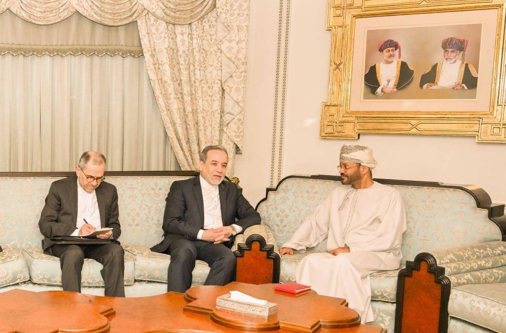 2026年2月6日,在阿曼首都马斯喀特,阿曼外交大臣巴德尔(右)会见伊朗外长阿拉格齐(中)。新华社发