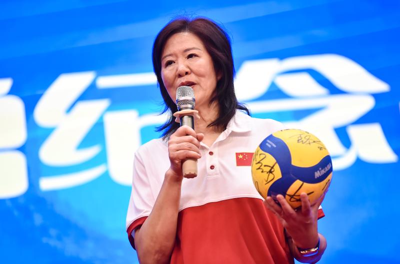 6月12日,郎平在活动中手捧赠予学校的中国女排签名排球 新华社记者 陈钟昊 摄