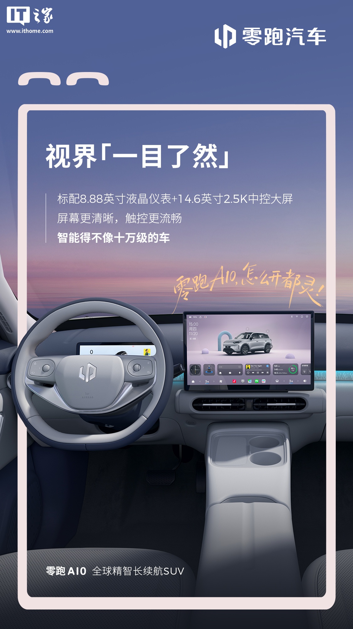 零跑汽车官方今日首次公布了零跑 A10 的内饰细节,整体采用简约化设计风格;该车标配 8.8 英寸液晶仪表 + 14.6 英寸 2.5K 中控屏。